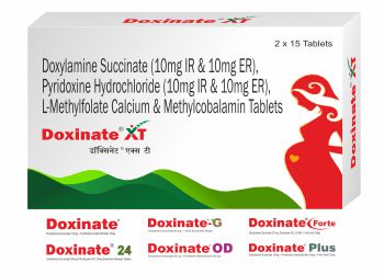 | DOXINATE PLUS Tablet | Each enteric coated Tablet contains : Doxylamine Succinate USP 10mg, Pyridoxine Hydrochloride IP 10 mg , Folic acid IP 2.5mg | Blister | 30T | Antiemetic | Nausea And Vomiting In Pregnancy |