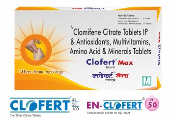 | CLOFERT MAX Tablet (Combikit) | Each Uncoated White Tablet contains : Clomifene Citrate IP 25mg & Brown Coloured Tablet contains Unidecarenone 60 mg , Zinc Sulphate 66 mg , Methylcobalamin 1500 mcg , Pyridoxine HCL 1.5 mg , Lycopene 4 mg , Selenium 200 mcg , Levocarnitine Tartarate 50 mg, Folic Acid 5 mg | Combikit Blister Pack | Kit of 55 Tablets (25 White Tablets of Clomiphene Citrate & 30 Brown Tablets of Antioxidants) | Infertility | Male Infertility |