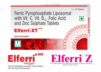 | Elferri-XT+ Tablet 10s | Each Film coated tablet contains: Ferrous Ascorbate equivalent to Elemental Iron 100 mg, Folic Acid IP 1.5 mg, Zinc Sulphate IP equivalent to Elemental Zinc 22.5 mg, Excipients q.s. | Strip | 10T | Haematinic | Iron Deficiency Anemia During Pregnancy & Lactation |